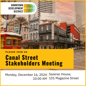 Downtown Development District invites interested Canal Street stakeholders to join us on Monday, December 16th at 10 AM for a special Canal Street Stakeholders Meeting hosted at Sazerac House (101 Magazine Street).